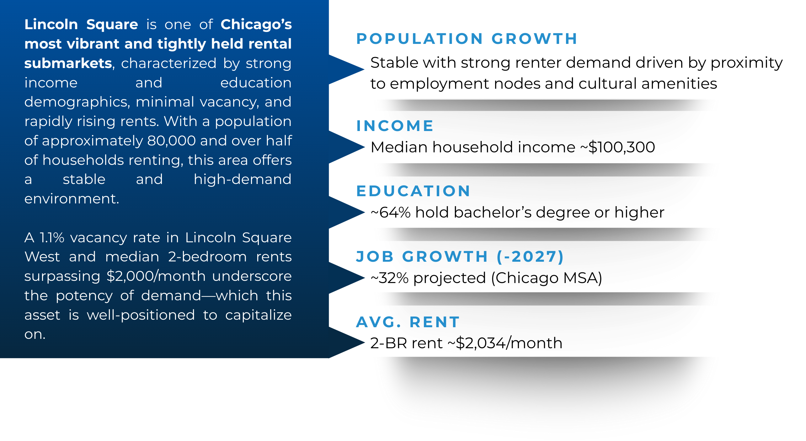 Chicago’s Andersonville submarket benefits from strong renter demand, excellent transit connectivity, and a deep pool of both young professionals and families. With vacancy rates around 4.7% and an effective rent growth forecast of 5.3% for 2025, the fundamentals support sustained NOI growth. Limited new supply further enhances the stability of this investment.